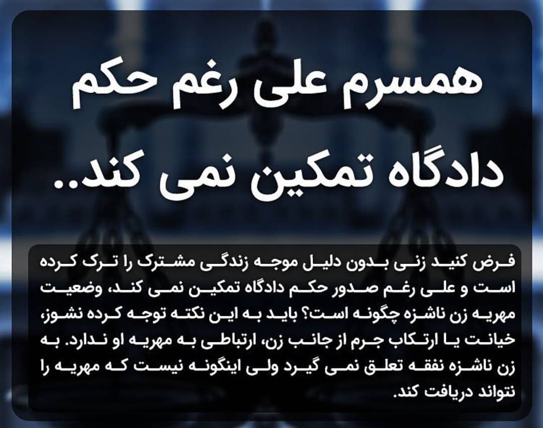 هرگاه زن همسرش را تمکین نکند و در اصطلاح حقوقی ناشزه شود همسر می تواند به دادگاه و محکمه حقوقی مراجعه کند و الزام زن را به تمکین خواستار شود. عدم تمکین طبق ماده 1107 ق م ایران نفقه عبارتست از همه نیازهای متعارف و متناسب با وضعیت زن از قبیل مسکن البسه غذا اثاث منزل و هزینه های درمانی و بهداشتی و هر آنچه را به صورت عادت یا احتیاج لازمه زندگی وی باشد. بدون رضایت بنده از خانه خارج شده مشغول به مشاغلی شده است که بنده راضی نبوده ام.