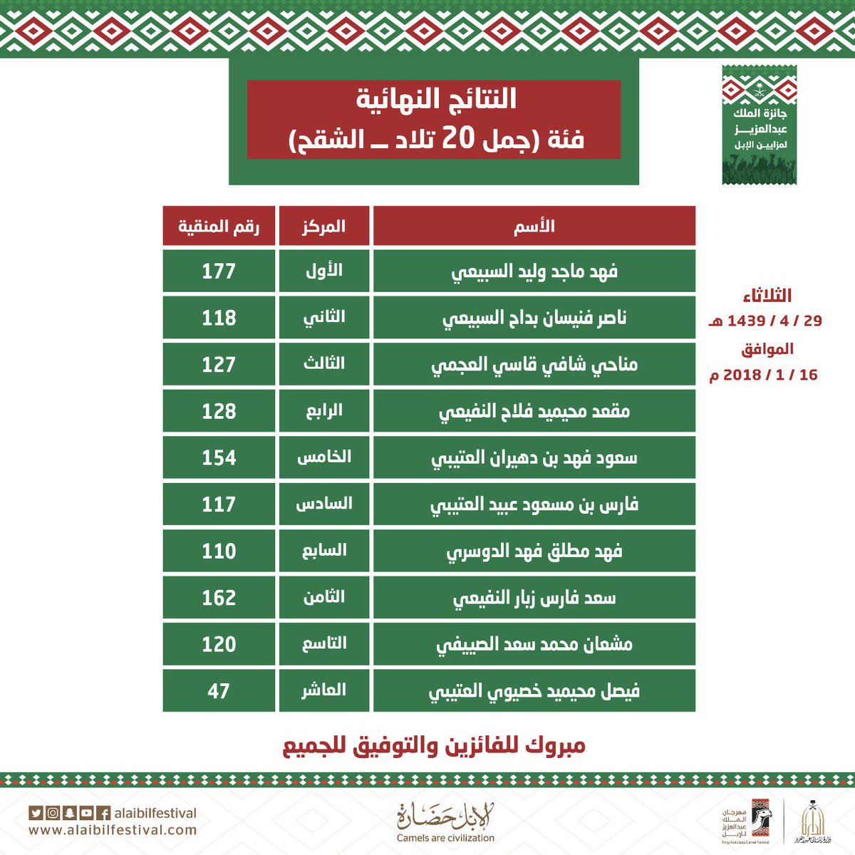 مهرجان الإبل Auf Twitter النتائج النهائية مهرجان الملك عبدالعزيز للابل الثاني لـ فئة جمل 20 تلاد الشقح جائزة الملك عبدالعزيز لمزايين الإبل الثاني مهرجان الابل حضارة وتنظيم Https T Co Sljini6bl0