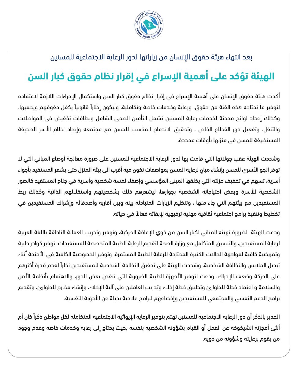 هيئة حقوق الإنسان على تويتر بعد انتهاء هيئة حقوق الإنسان من زياراتها لدور الرعاية الاجتماعية للمسنين الهيئة تؤكد على أهمية الإسراع في إقرار نظام حقوق كبار السن السعودية حقوق الإنسان Https T Co The5menwat