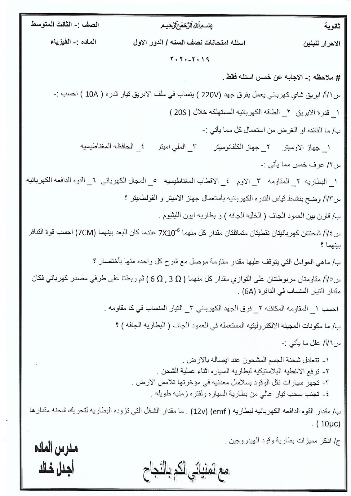 اسئلة فيزياء ثالث متوسط نصف السنة 2020 الفيزياء المتوسطة