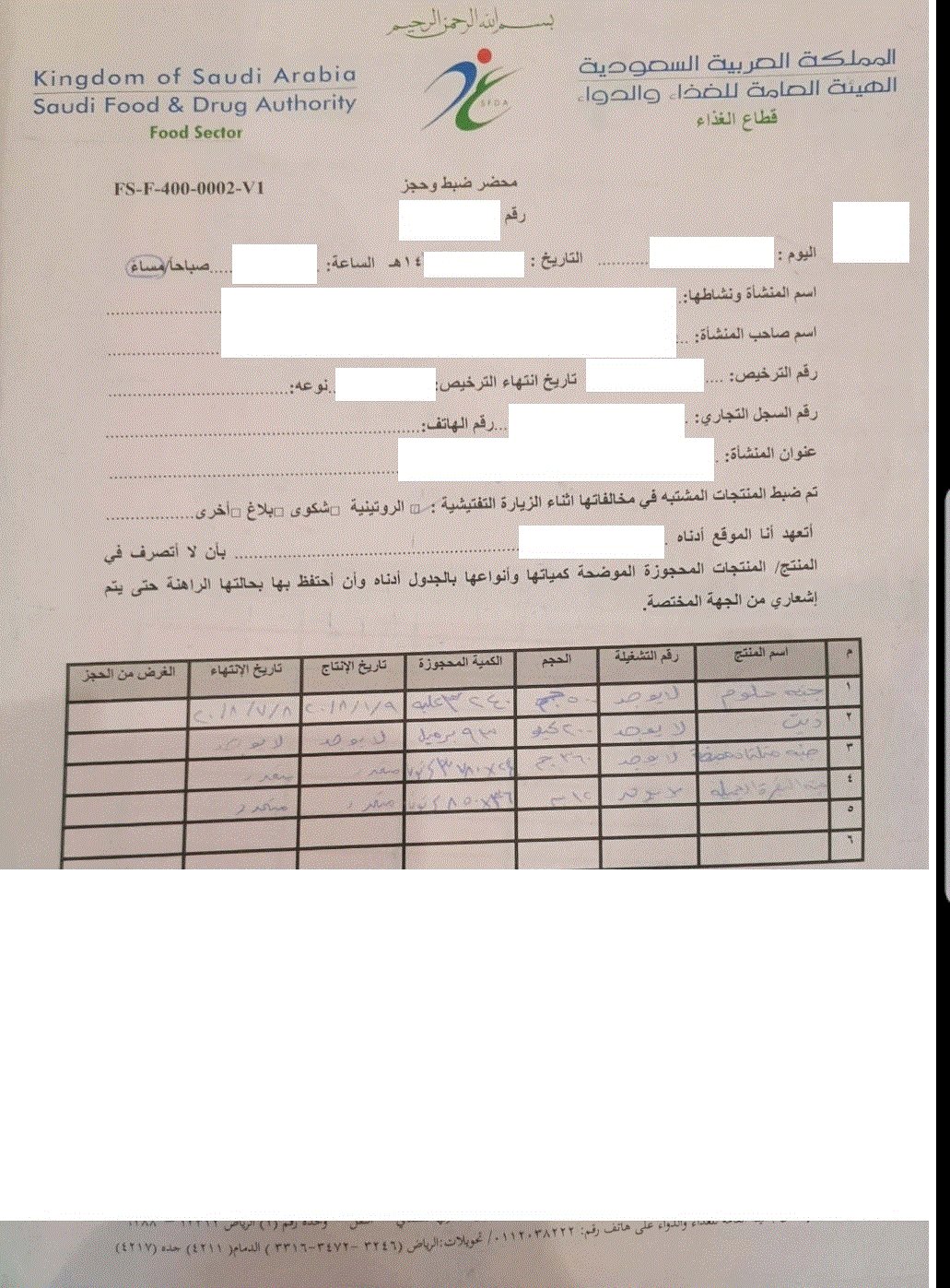 محضر الاتلاف ويتضمن اتلاف دجاج واواني حديدية وفي الأطار ضيف الله العتيبي