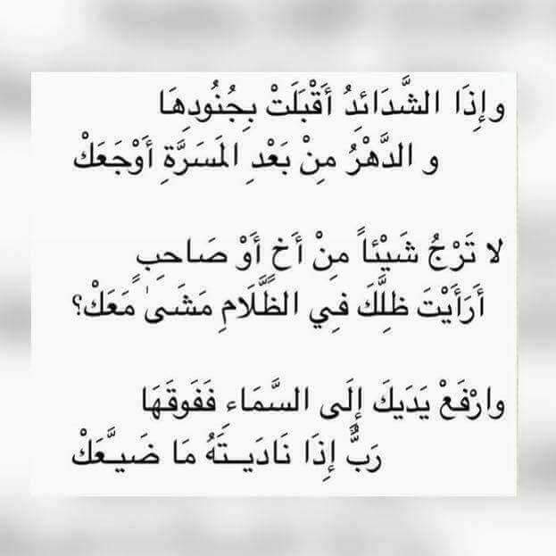 مصطفى الناصري No Twitter واذا الشدائد اقبلت بجنودها والدهر من بعد المسرة اوجعك لا ترج شيئا من اخ او صاحبأرئيت ظلك في الظلام يمشي معك وارفع يديك الى السماءففوقها رب ا Https T Co Pyybilonxs