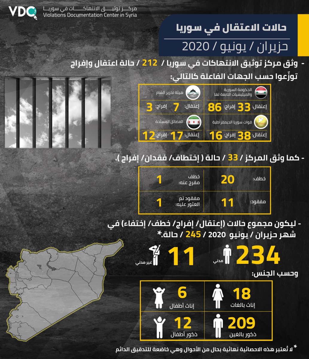 Violations Documentation Center In Syria Vdc On Twitter وثق مركز توثيق الانتهاكات في سوريا 245 حالات اعتقال وإفراج وخطف واختفاء في سوريا خلال شهر حزيران يونيو لعام 2020 Https T Co Jlegaurtgy