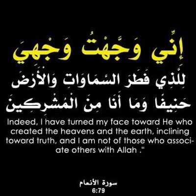 3 وجهت وجهي للذي فطر السماوات والأرض حنيفا وما أنا من المشركين إن صلاتي ونسكي ومحياي ومماتي لله رب العالمين لا شريك له وبذلك أمرت وأنا من المسلمين اللهم